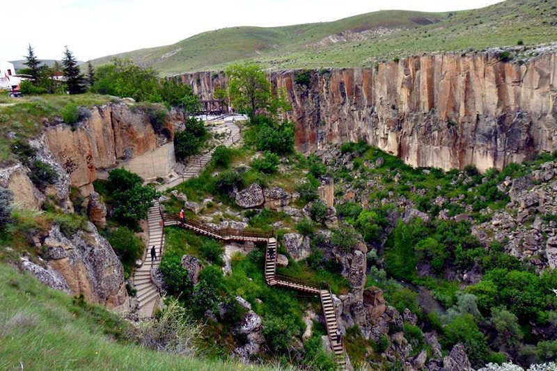 Outside the triangle to the south are the remarkable underground cities of Derinkuyu and Kaymakli, where layers of tunnels and an intricate system of caves hid generations of settlers and sheltered early Christians fleeing persecution. The Ilhara Canyon is another religious hideaway with more than 100 painted churches and about 4,000 dwellings carved into the rock walls or concealed within the cliffs; its river bed and lush vegetation stand in stark contrast to the dusty, seemingly barren land above.
