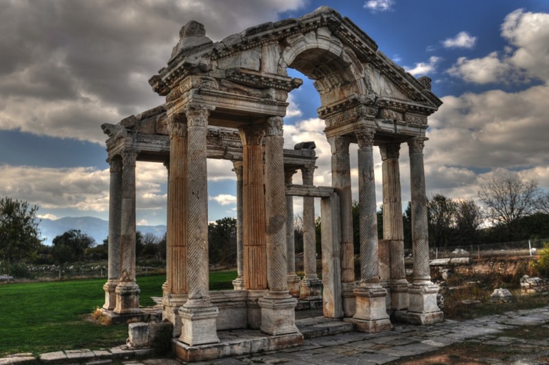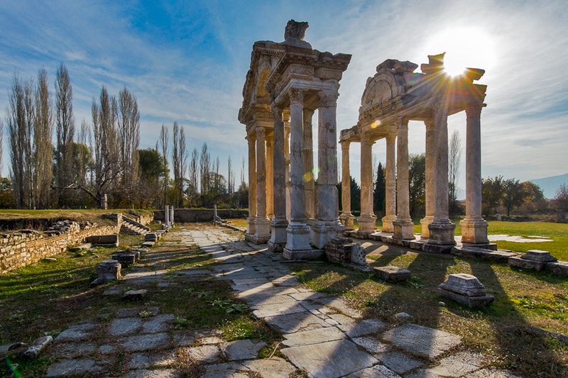 The ancient city of Aphrodisias, once the capital of the province of Lydia, is located near the village of Geyre in the district of Karacasu 38 km south of Nazilli.In ancient times, the attractive marble buildings of Aphrodisias no doubt shone out, as they do now, from amidst the rich vegetation of the Dandalaz valley with its almond, pomegranate and poplar trees. The wealth and cultural and political importance of the city is clearly attested by the size and magnificence of the buildings of which it is composed.The name Aphrodisias is derived from Aphrodite, the goddess of nature, beauty, love and plenty, and was one of the most famous cult centres of the goddess. But this was not the original name of the city. According to the historian Stephanus it was founded by the Lelegians and was first known as Lelegonopolis.The name of the city was later changed to Megalopolis, and later again to Ninoe after Ninos, the King of Assyria.