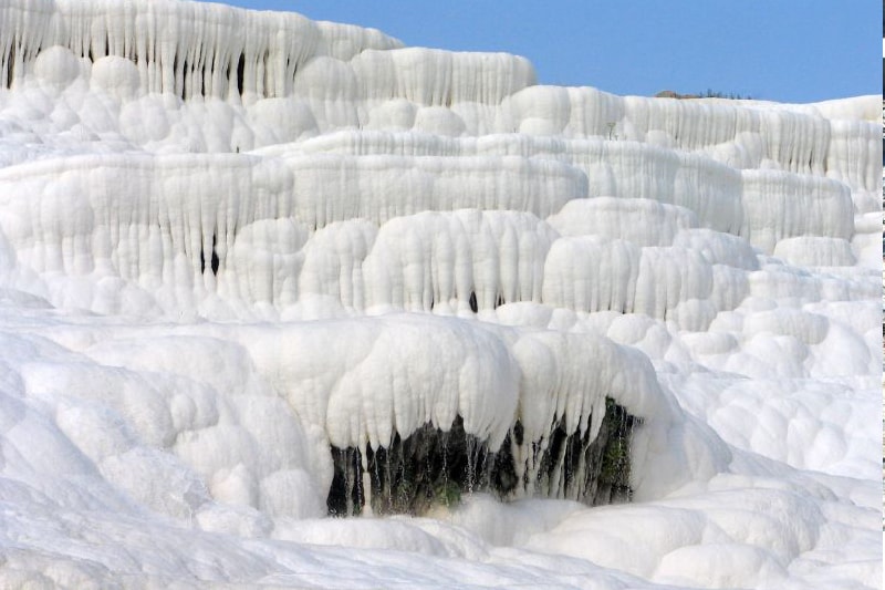 Pamukkale is located in the Inner Aegean region at a distance of 20 km from the town of Denizli. This lovely, rapidly developing district in the Menderes valley, which enjoys a temperate climate over the greater part of the year, has all the conditions required for an ideal touristic resort.The tectonic movements that took place in the fault depression of the Menderes river basin gave rise to the emergence of a number of very hot springs, and it is the water from one of these springs, with its large mineral content, chalk in particular, that has created the natural wonder now known as Pamukkale, Cotton Fortress or Baumwollenschloss, a very appropriate name for such a phenomenon...